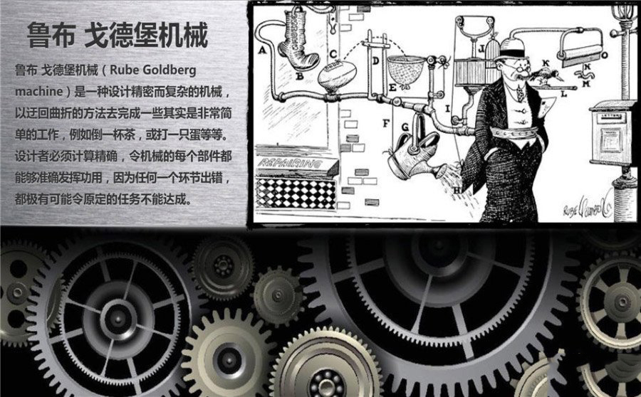 魯布·戈德堡機械(Rube Goldberg machine)是一種被設計得過度復雜的機械組合,以迂回曲折的方法去完成一些其實是非常簡單的工作,例如倒一杯茶,或打一顆蛋等等。設計者必須計算精確,令機械的每個部件都能夠準確發揮功用,因為任何一個環節出錯,都極有可能令原定的任務不能達成。由于魯布·戈德堡機械運作繁復而費時,而且以簡陋的零件組合而成,所以整個過程往往會給人荒謬、滑稽的感覺。