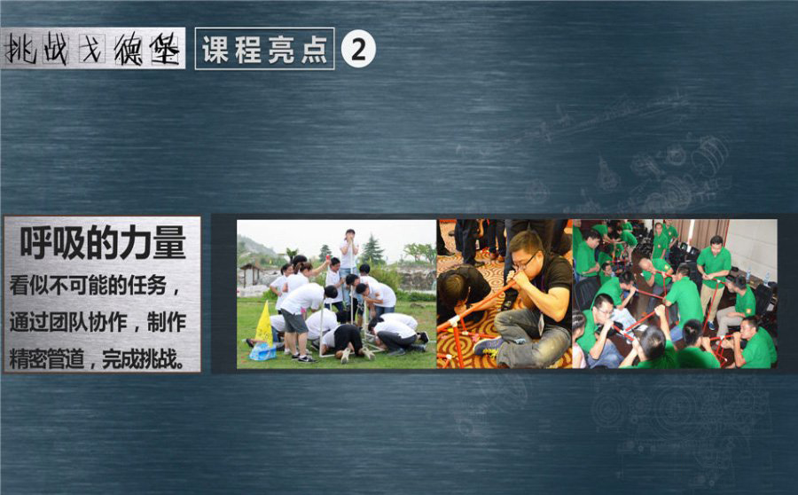 拓展課程任務:團隊所有伙伴使用超過50種道具完成一個巨型的能力傳遞反應機械,最終將一個很小的能量放大到推到一面代表團隊目標的杯墻!