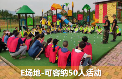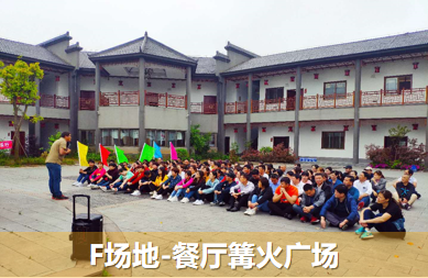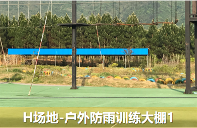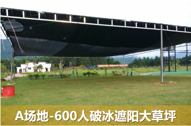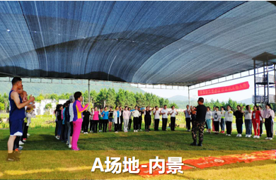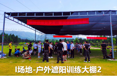 基地內有兩塊戶外遮陽及防雨訓練大棚場地,配置防雨彩鋼棚、水泥地面、遮陽網、天然草坪,小場地可容納50-80人活動,大場地可容納近千人;另外餐廳及住宿區的篝火廣場、停車場也可以作為拓展場地使用,還可容納近200-300人。