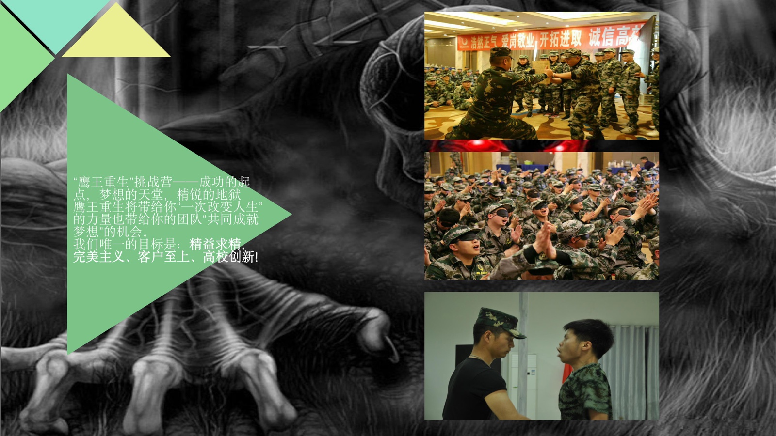 每個(gè)人都有屬于自己得天獨(dú)厚的優(yōu)勢(shì),每個(gè)人也有著自身需要完善的地方。魔鬼訓(xùn)練營不是單純的企業(yè)軍訓(xùn),僅僅是為了提高團(tuán)隊(duì)的執(zhí)行力和精神面貌、也不是團(tuán)隊(duì)拓展訓(xùn)練,培訓(xùn)后的效果得不到具體化、更不是企業(yè)內(nèi)訓(xùn)課程,老師講的多,學(xué)員自身實(shí)踐的少。魔鬼訓(xùn)練課程是一個(gè)根據(jù)不同團(tuán)隊(duì)和人群,進(jìn)行因材施教的過程,比如喜歡半途而廢的團(tuán)隊(duì),我們就磨礪他們矢志不渝的恒心、做事毫無主見、喜歡人云亦云的團(tuán)隊(duì),我們就著重提高他們?cè)诠芾矸矫娴募寄堋⒉簧朴跍贤ū磉_(dá)的團(tuán)隊(duì),我們就訓(xùn)練他們的公眾演說能力!